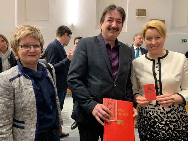 Bundesministerin Franziska Giffey staunte nicht schlecht, als ihr Toni Fotopoulos das Parteibuch seiner Urgroßmutter Paula Klösel aus dem Jahr 1919 zeigte. Sie gehörte zu den Frauen, die ihr Wahlrecht sofort ausübten.